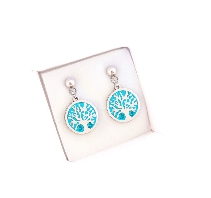 Pendientes de presion con forma de ábol de la vida, realizados con cristal blue circon.
